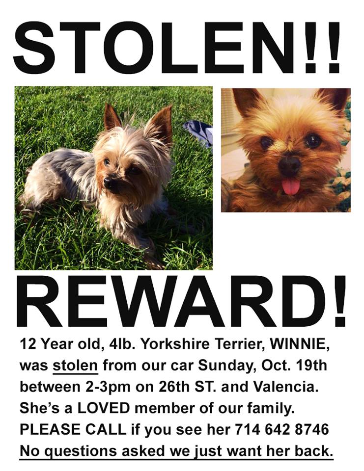 A reader reported that her car was broken into on 26th and Valencia Sunday. Rather than money or stereo, the thieves stole her dog. Here’s the message she sent and (the reward poster pictured above):