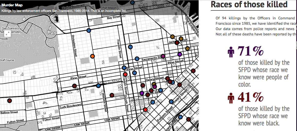 The Anti-Eviction Mapping Project has mapped the shootings of San Francisco police officers since 1985 that have ended in deaths. In its release, the project said the list is incomplete, but that of the 94 killings it identified the race of 90 of the victims and found 39 percent were black, 28 percent white, 11 percent Asian and 10 percent were Latino.