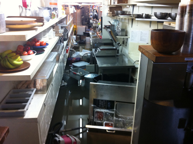 As the rains continued to beat down today, businesses in the area near Folsom and 17th fought once more against nature and the area’s tendency to flood with the Stable Café estimating damage of $80,000 to $100,000.
