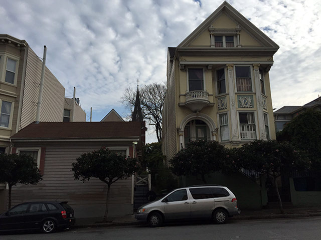 I noticed John on Thursday morning, his chair against the wall, his sketch pad on his lap, his eyes looking at the three buildings in front of him, an apartment, a church spire and a Victorian. He lives on Albion but came over to Capp to sketch. “Difficult,” he said of the menagerie of architectural elements.