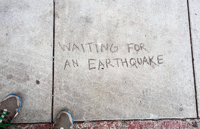 The communities most affected my natural disasters always are the ones with the least amount of financial resources. People who can’t afford to live here often say that same message, “well I can’t wait for the big one to strike and then everyone will leave and I will be sitting pretty”. The marina got wrecked and us common folk were still priced out. It is a terrible thing for people to wish for. To scratch it into the sidewalk is pointless.