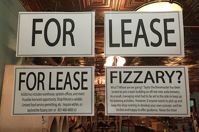It’s a neatly told news story in one photo. The Fizzary at 2949 Mission Street will close because Taylor, the brewmaster, will be going on to build an off-site soda brewery, leaving this space and apparently upstairs and a warehouse open for a new tenant – all for $4500.
