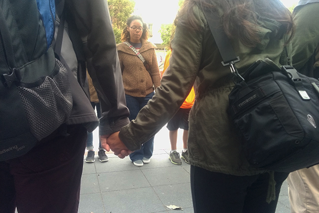 Roughly 20 people silently made their way from the Episcopal Church of St. John the Evangelist at 15th and Julian Streets Friday evening to Mission Police Station. There, they lit a candle and prayed for Amilcar Pérez Lopez, his family, and others affected by violence.