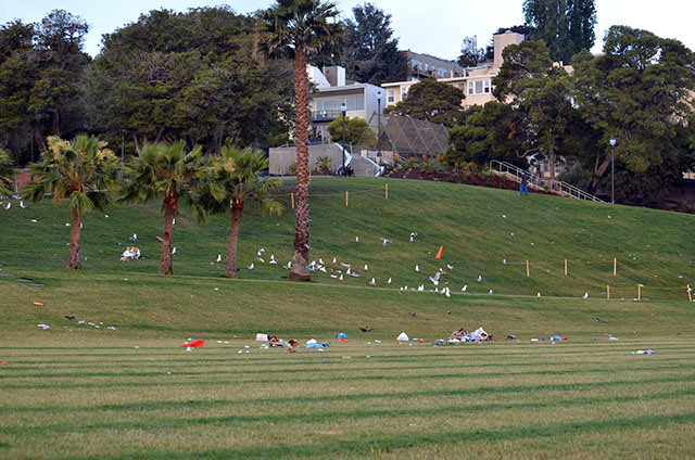 At the end of a full day of visitors at Dolores Park on Saturday, the lawns were in pretty good shape and most of the trash had been picked up, but that changed later at night after dozens of revelers celebrated July 4th. By 6 a.m. today the park was awash in trash.