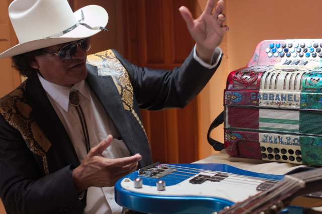 He wore a cowboy hat and boots, a black suit with snake-skin accents on the shoulders, and a pair of dark aviators that he never removed, even though we immediately went indoors. He looked much younger than his 66 years, which is what people tell him.