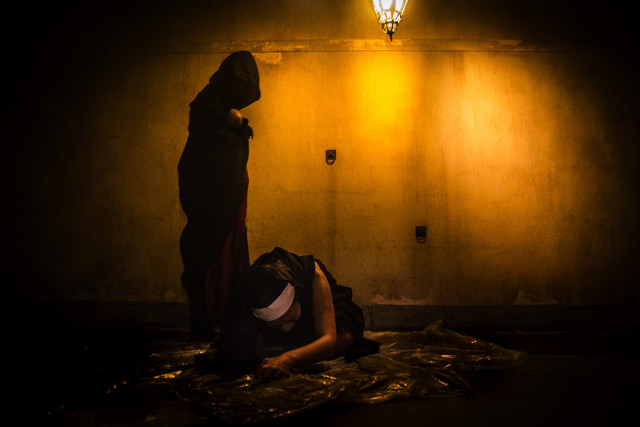 Another man lead each of us to a chair and sat us down, picking up the plastic bags on the floor and covering our heads with them. We were then walked, blind, into another room and made to hold onto a rope above our heads, pushed forward across a wet and uneven floor.