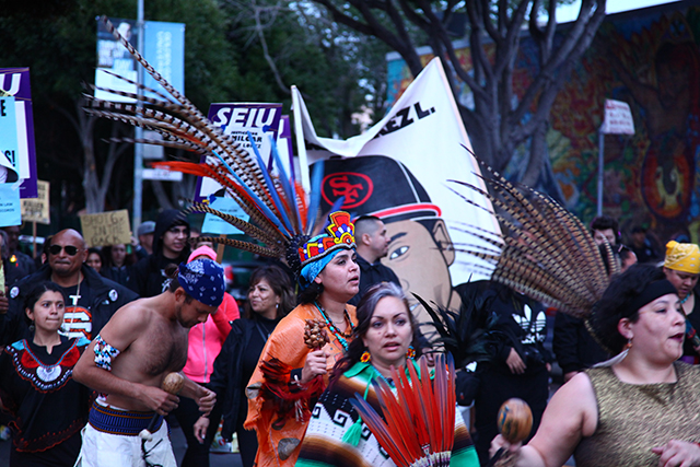The protestors marched west on 24th Street, stopping briefly for dancers to dance in the intersection of 24th and Mission streets before heading north on Valencia toward Mission Police Station.