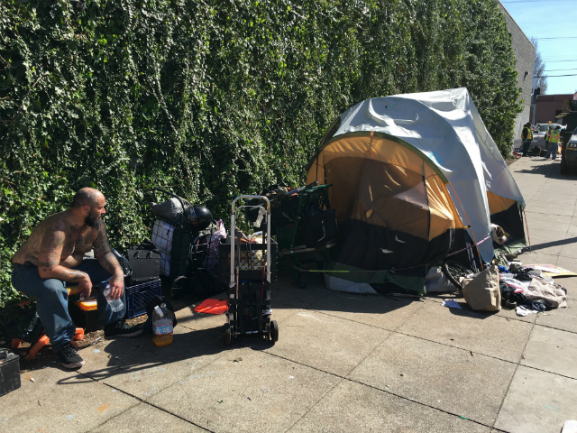 Ashante Jones outside his camp site on Division Street. “Me, myself, I’m not going anywhere,” he said. Photo: Joe Rivano Barros / Mission Local.