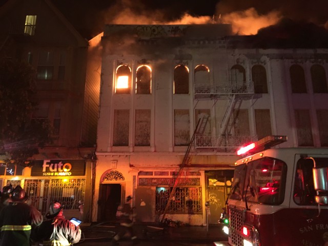 A 3-alarm fire broke out at the previously fire-damaged building at Mission and 22nd streets shortly after 11 p.m on Sunday night. No injuries have been reported beyond some cuts and bruises among firefighters.