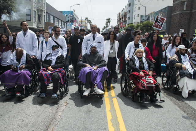 Chants of “Fire Chief Suhr” and “No justice, no peace” accompanied the crowd as it moved down Mission Street with a police escort. A human chain formed around the wheelchair-bound hunger strikers as protesters began chanting “Whose streets? Our streets!”