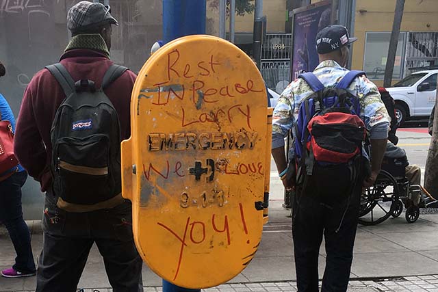 Candles and the words “Rest In Peace Larry, We Love You” scribbled across a 911-emergency phone box at the northeastern corner of the 16th and Mission BART Plaza mark the spot where Teevy died.