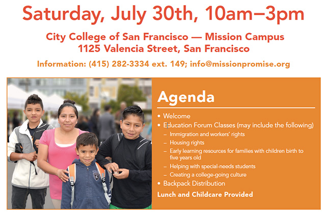 CCSF’s Mission Campus is at 1125 Valencia Street. No pre-registration is required, but more information can be obtained at info@missionpromise.org.
