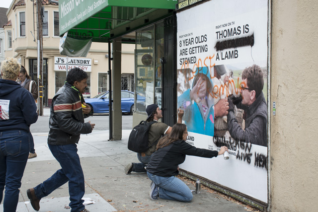 Two passerby stopped to inquire what was going on as the group went from ad to ad. One said while he understood why the residents took offense, he didn’t see the graffiti-censorship as particularly effective. Another was thrilled, and said the ads had bothered him too.