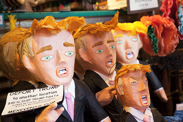 With their tiny hands and oversized empty heads, the Trump piñatas are a perfect likeness of the Republican candidate who says he’ll build a wall between the United States and Mexico. The figures are works of art. Their crafted immobile faces seem dynamic, as if they were frozen right in the act of saying something derogatory about Mexicans.
