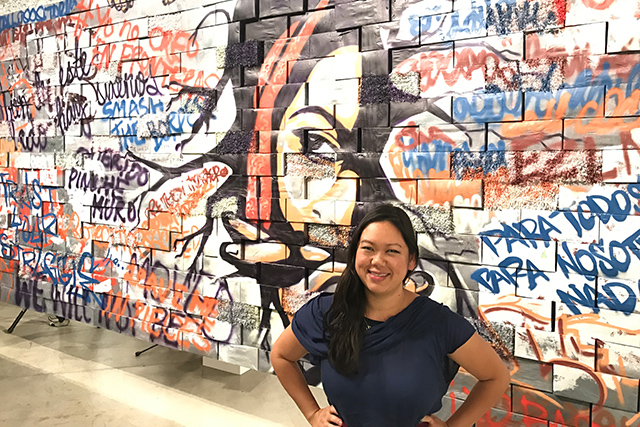 As any structure built to divide, artist Sita Bhaumik’s wall has already been vandalized by graffiti from the Mission District’s youth and guest artists – this time by invitation. Hovering over the floor of Southern Exposure’s gallery, the wall is the main feature of the exhibition “We are against the wall/Estamos contra el muro,” a direct reference to Trump’s promise to build such a barrier between the United States and Mexico.