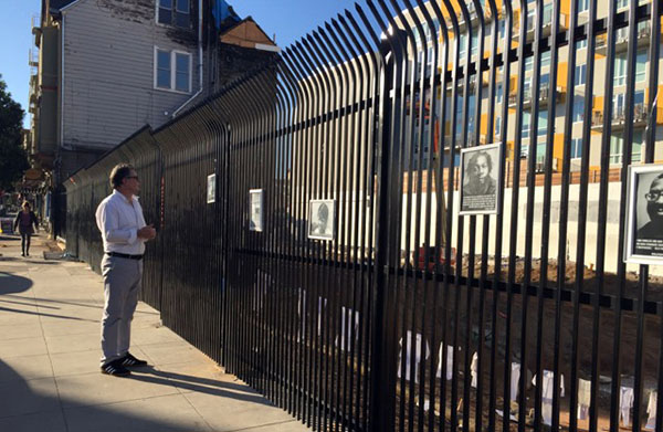 The photos hang by wire along the black iron fence that encloses a hole at 22nd and Mission streets that used to be the site of a 105-year-old building. It was destroyed in a January, 2015 fire that displaced more than 60 people.