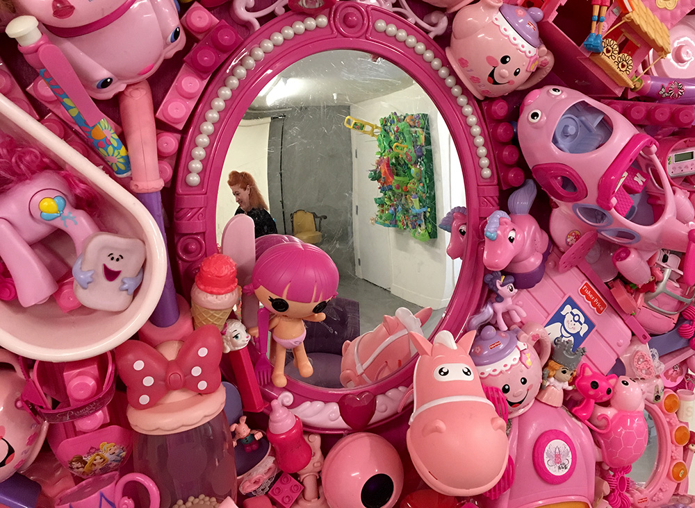 Through the lens of these discarded toys and materials, and especially with color, Bohan also explores gender and how gender roles are enforced. The pieces are interactive, Boedihardjo noted, allowing and even inviting the viewer to touch, to play – one piece, for example, includes a mirror. Another, during one mid-January visit, sported a large gap where someone had pulled off an element.