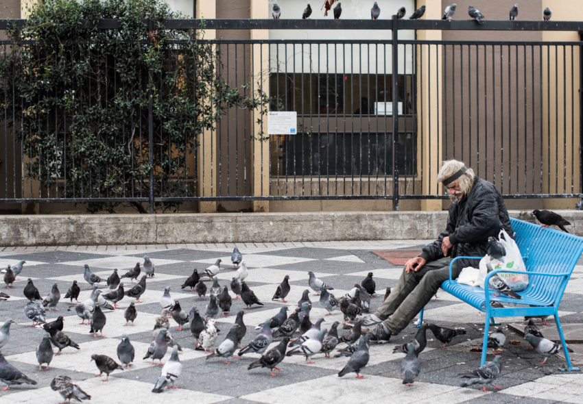 “This is its home now,” he says as he stares off toward the BART Station in front of him on 16th and Mission streets. Dozens of other pigeons surround him, pecking rice off the cement.