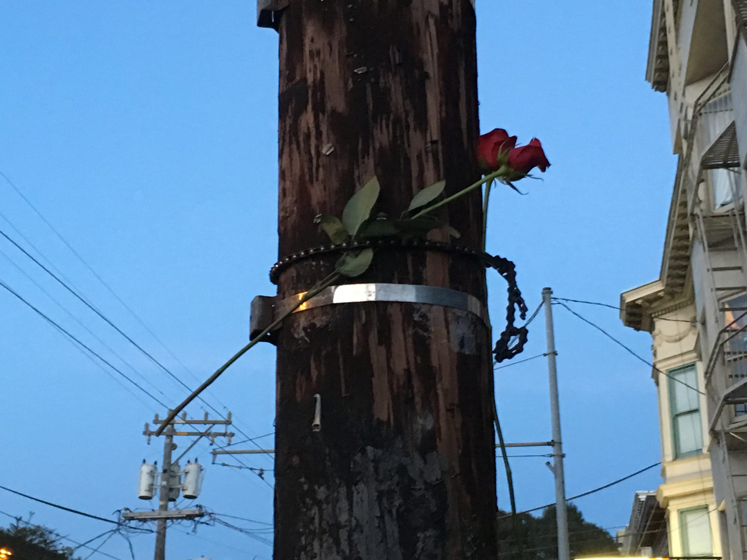 Kristina instructed Chris to wrap a bike chain around a utility pole, a few steps from the spot where Hopkins collapsed after the stabbing. She then threaded the chain with roses.