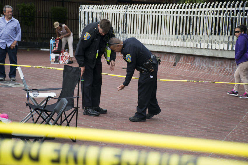 Police at 24th and Mission locating possible blood drops. Photo by Lola M. Chavez