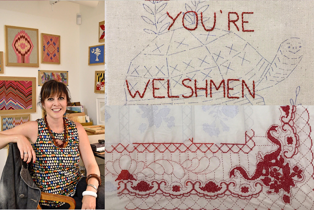 Redwork embroidery is what I do with my work that’s about parenthood, because I feel that the material is a very appropriate one for the topic. The other material that I use in the redwork is vintage tablecloths for embroidery. I was experiencing sitting at the table with my 20th cup of coffee, and babies crying, and just kind of slowly losing my mind. And red seemed so appropriate for, just, kind of a madness that sets in.