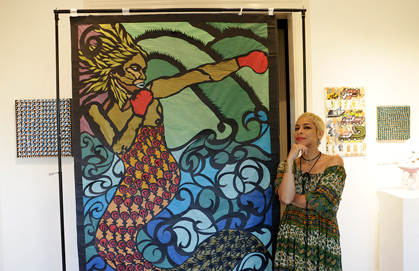 One piece, La Sirena Feminista, tackles the topic of machismo in the Latino community. The work, created in 2015, is based on a traditional Mexican card game known as the Lotería. The face of la Sirena is that of Beatriz.