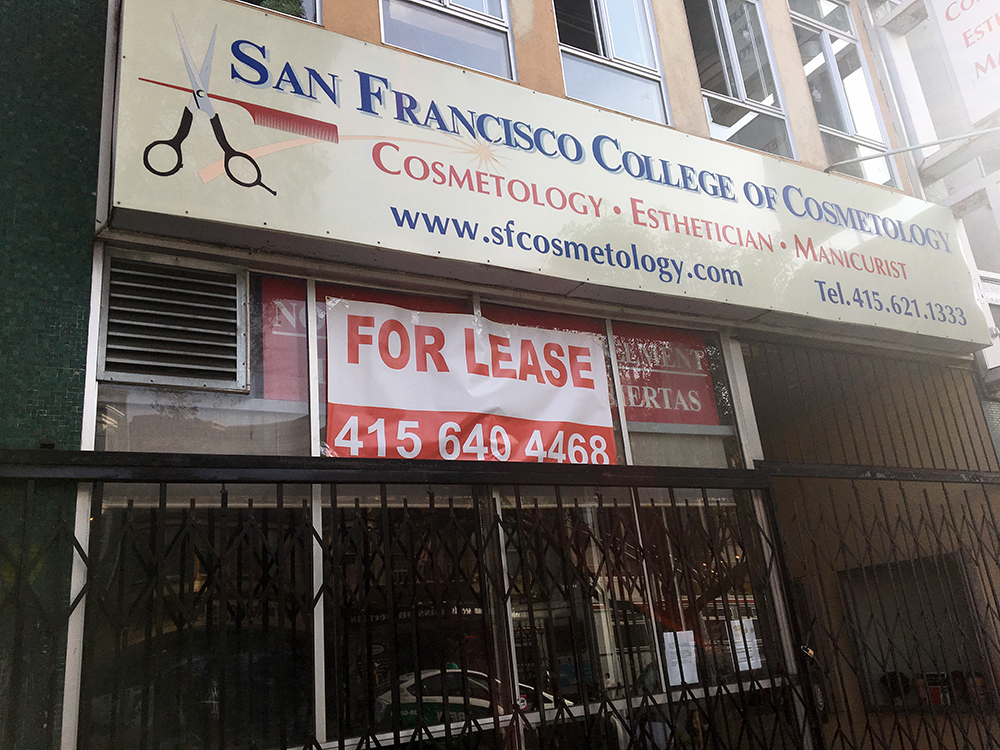 Clients looking for a new look that’s easy on the wallet may be in for an unpleasant surprise: The San Francisco College of Cosmetology, on Mission Street near 16th, appears to have permanently closed its doors. The space bears a large “for lease” banner and a sign in the door hints at perhaps an abrupt closure:
