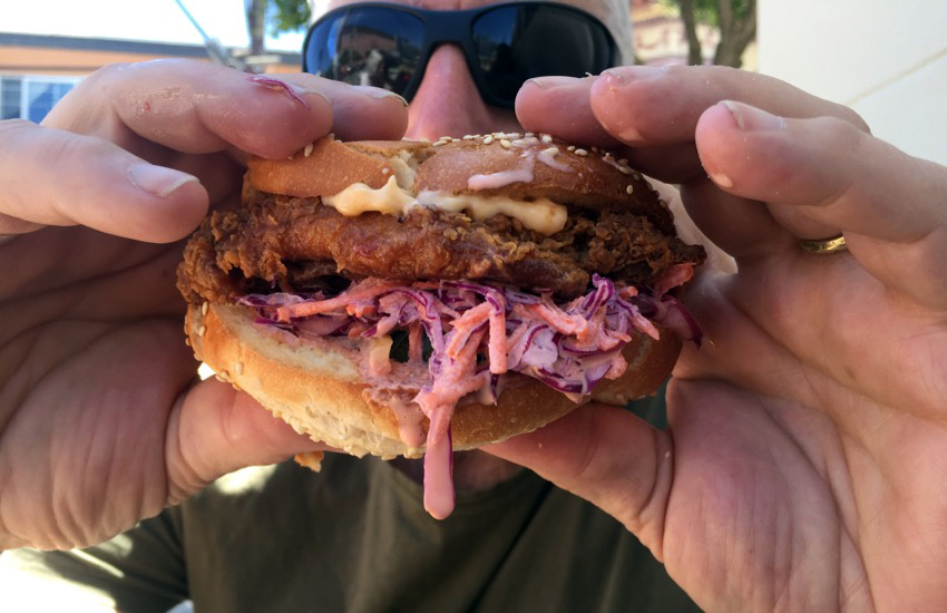 Slightly unnerving, however, was the Pepto Bismol-colored juice that spewed out of the sandwich and onto my hands at first bite. That must be what happens when purple cabbage coleslaw collides with chili aioli.