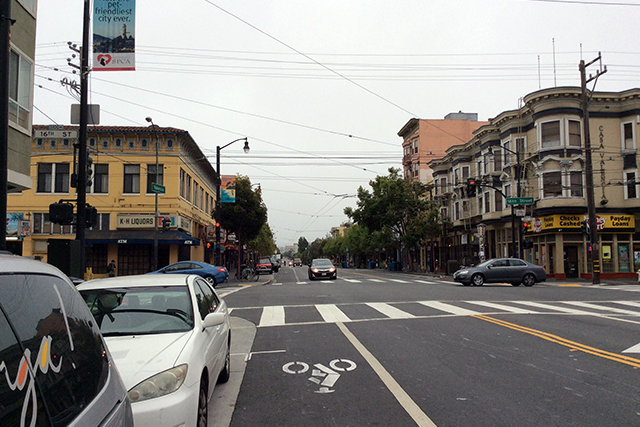 Operating in “autonomous mode,” the Cruise AV was stopped at a green light, facing north on Valencia, waiting to make a right turn onto 16th Street as pedestrians crossed.