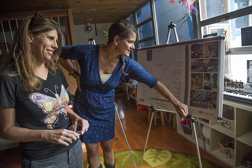 Mission Kids Co-Op directors Heather Lubeck and Christina Maluenda Marchiel look at floor plans for their proposed new building. Photo by Abraham Rodriguez.