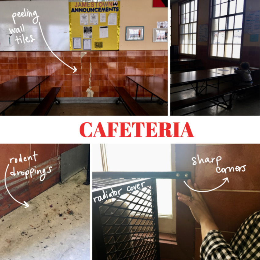 Rodent droppings in classrooms and cafeteria. Holes in the walls and ceilings. Radiators that are hot to the touch. Crumbling floors and ceilings. No soap. No toilet paper. Parents, in fact, supplying kids with toilet paper from home.