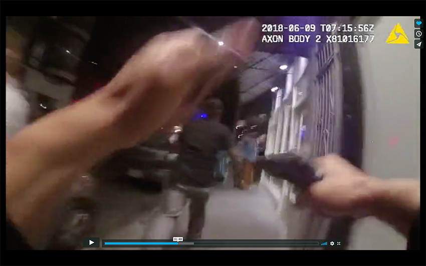 Seconds later, Barcenas ran away down Grant Street. Body-mounted camera footage of the incident shows Barcenas reaching for the handgun and throwing it away as he ran. “Milliseconds” later, the DA asserts, Cabillo shot Barcenas in the back as Barcenas ran past three people on the street (the actual time between the gun being tossed and Barcenas being shot was around two seconds).