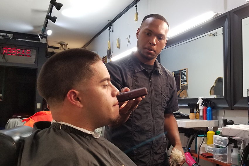 Barber Dejon Boyd, right, gives Christian Tiznado, left, a fade at The Barberhood in the Excelsior district. Photo by Abraham Rodriguez.