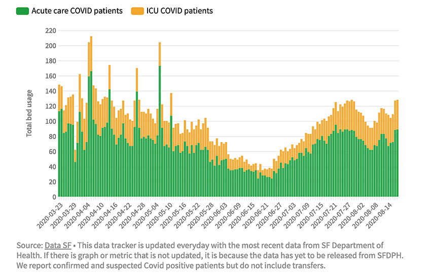 More cases mean more hospitalizations. Not since July 27 have the City’s hospitals reported 128 Covid confirmed and suspected patients, the figure given for August 18. The number of available beds has dropped to 75 in ICU beds, and 304 in Acute Care beds. The City’s seven-day rolling average percentages of ICU and Acute Care beds available, continues to meet the target set by DPH.