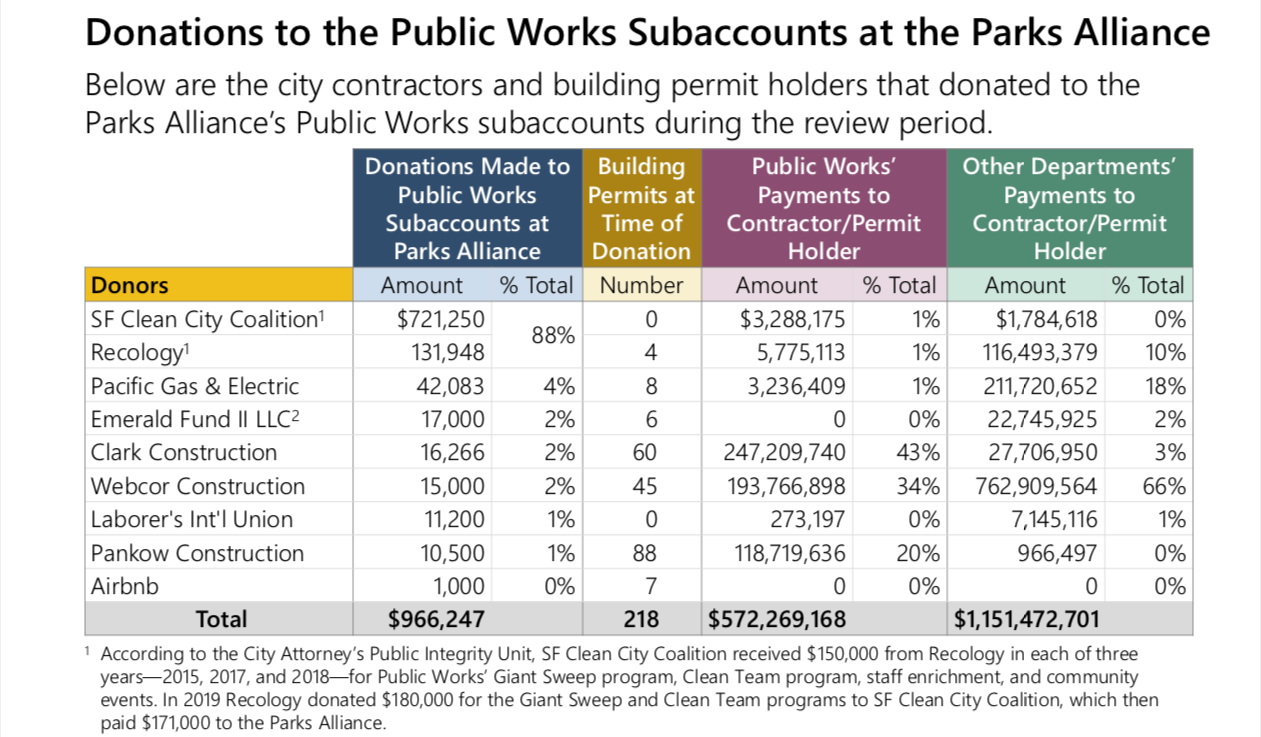 But wait: In the footnotes, it reveals that, during the five-year window of this probe, Recology — which has enjoyed a city charter-enshrined monopoly to haul San Francisco’s waste since 1932 — gave $630,000 to Clean City. In fact, in 2019 alone, Recology donated $180,000 to Clean City, which then turned around and paid $171,000 to the Parks Alliance.