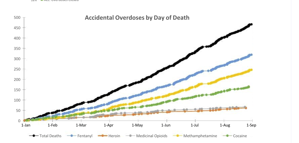 Fentanyl accounts for the lion’s share of this year’s 450 deaths, at 300+ (for reasons unknown, the medical examiner’s report, embedded below, does not include the actual numbers of deaths by overdose, instead providing rough figures on a graph).