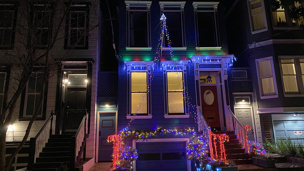 Lydia, check out the , well they are not decorations per say but a comment on where we are at this time of year in terms of the pandemic and the holidays . The installation is at 760 Shotwell St. one is titeled X-mas unplugged, emphasis on the X. The other , same address is in the window ,an homage to Time magazines recent cover,”The worst year ever” also emphasis on the X. There are none of the typical decorations , lights per say. So it is best to see during the day, but to cover your bases check it out at night as well. A large large glowing red orb, one that lends an ominous mood tied to the Time magazine cover. Enjoy it, I’m told its a hit.