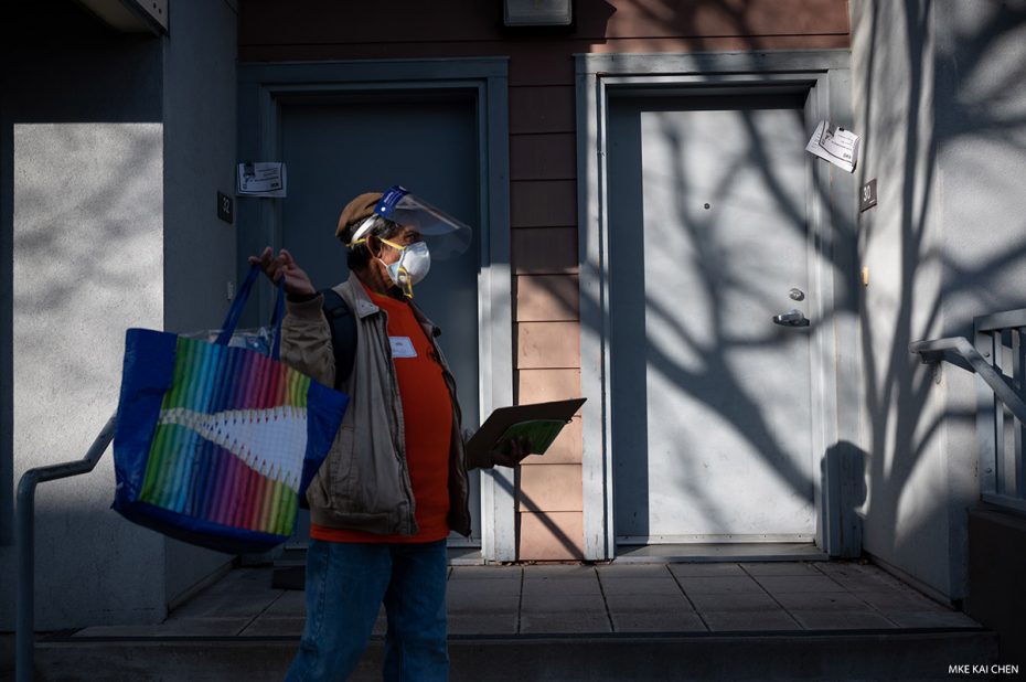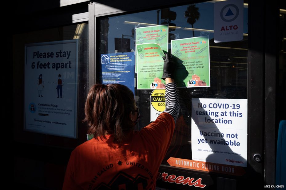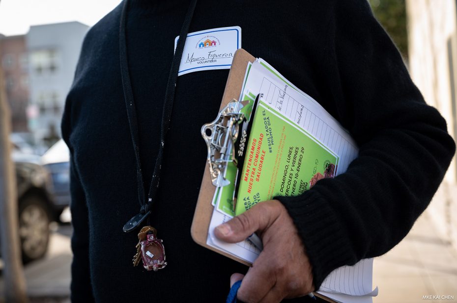 Construction worker and Unidos En Salud volunteer Melitón Ruiz canvasses the neighborhood. Ja. 8, 2021 Photo by Mike Kai Chen.