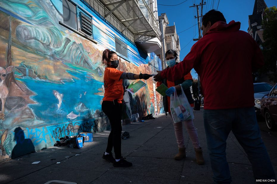 Volunteers work to inform the community that San Francisco is in the midst of a surge but testing is available at the 24th Street BART plaza. Photo by Mike Kai Chen
