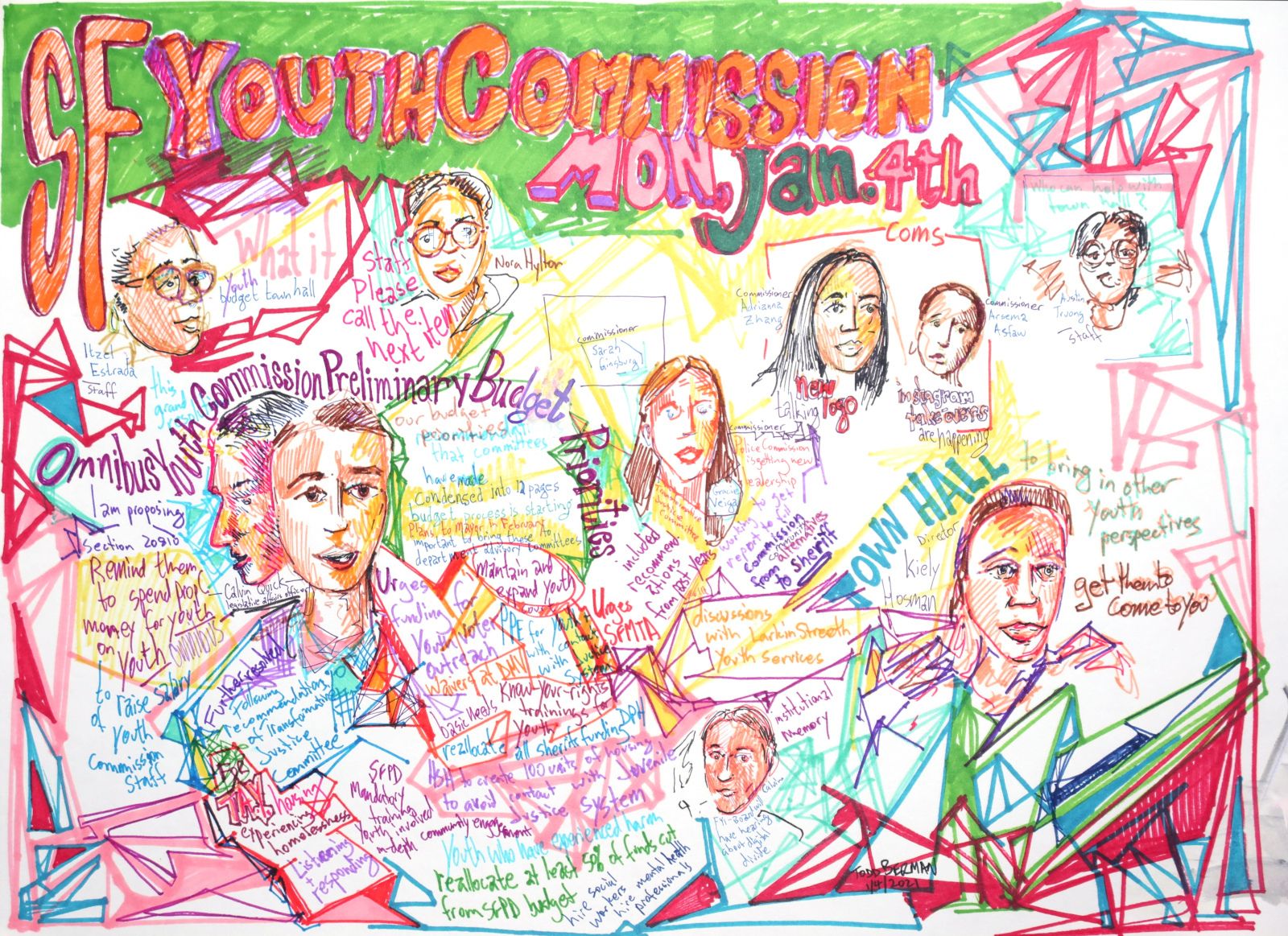 The San Francisco Youth Commission meets on the first and third Mondays of each month for the purpose of advising the Mayor and the Board of Supervisors on matters concerning the children and youth of San Francisco. Drawing by Todd Berman of the Jan. 4, 2021 Youth Commission meeting.