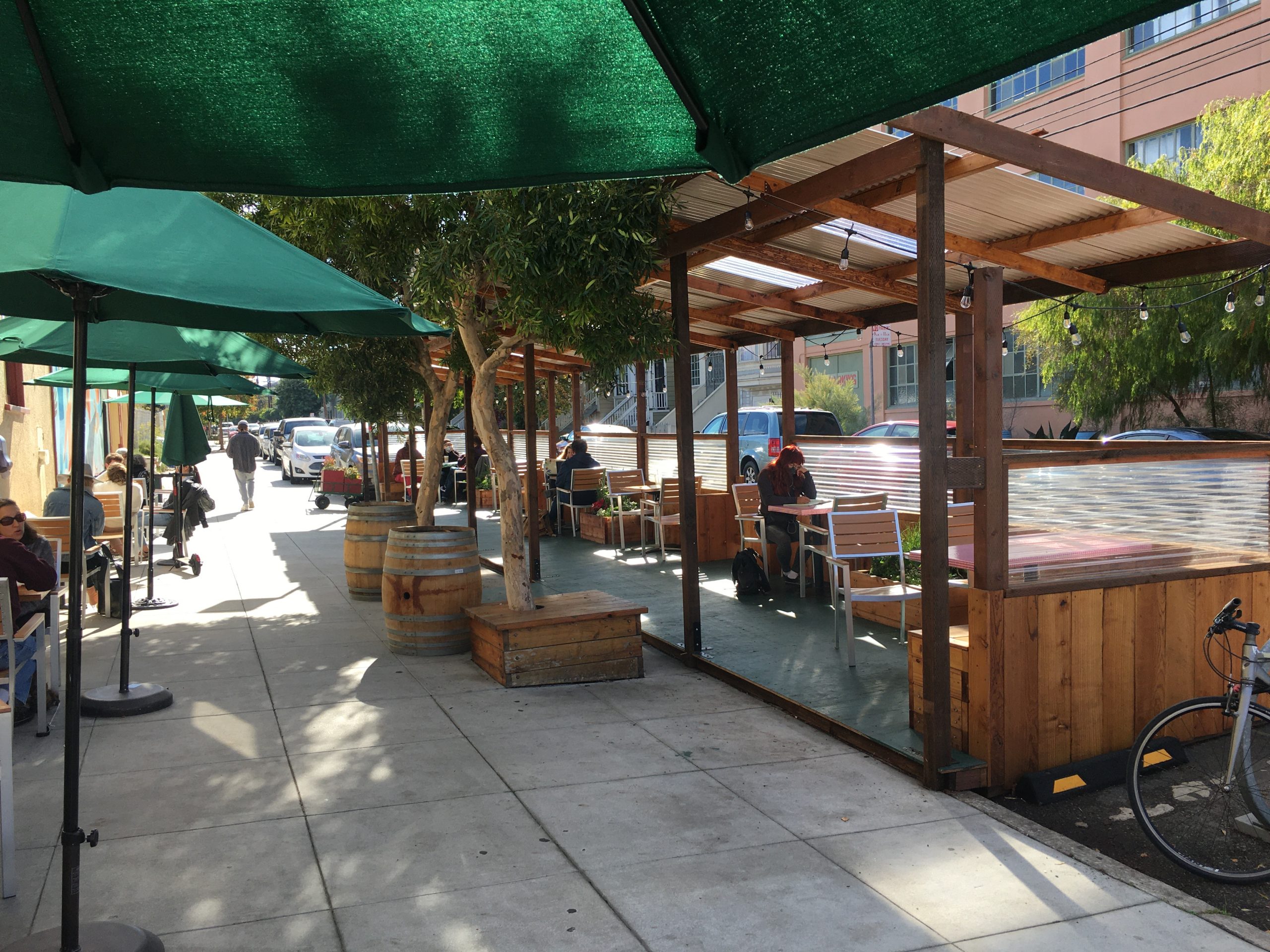 When the carpenter had a motorcycle accident in early September, a handful of Stone’s friends filled the vacuum and finished it up. A neighbor added a roof for “whatever” Stone could afford to pay. Once done, the parklet filled with customers and, through the fall, helped to mitigate some of Atlas’s losses. Pleased with the look and business, Stone said he’d try to keep it permanently.