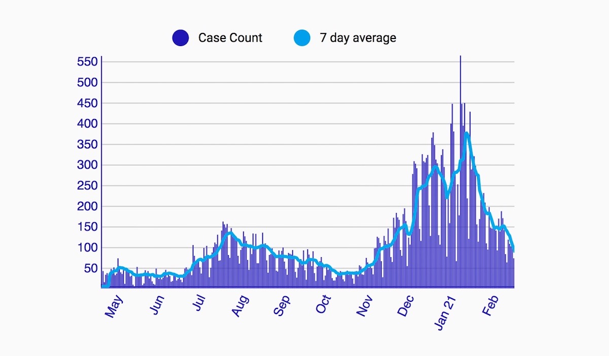 Cue the trumpets! For the week ending February 8, the seven-day average of daily new cases in the City dropped below the summer surge peak to 128, or 15.9 new cases per day per 100,000 residents. The number hasn’t been this low since November 28.Ā
