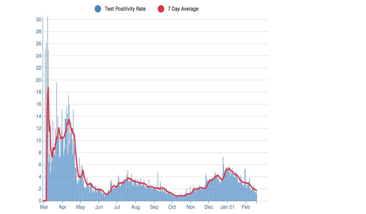 For the week ending February 14, the seven-day average of daily new cases in the City was 89, or 10.2 new cases per day per 100,000 residents.Ā