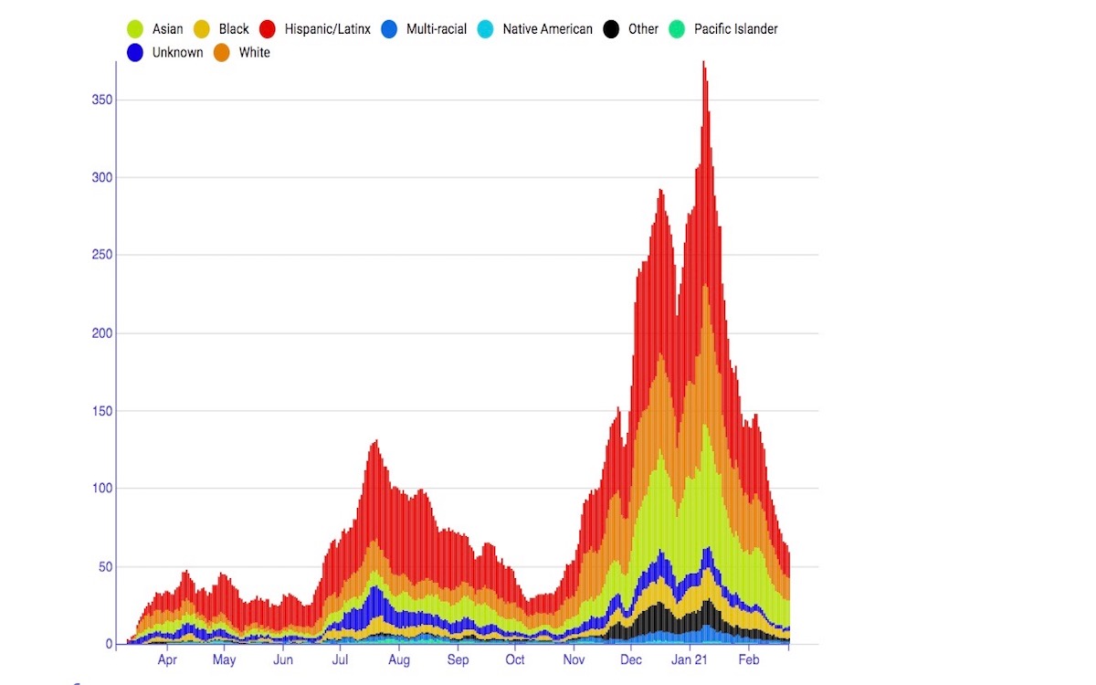 As of February 22, Latinx residents had 32 percent of the month’s new cases, while Asians had 27 percent, Whites had 24 percent, and Blacks 7.4 percent.Ā