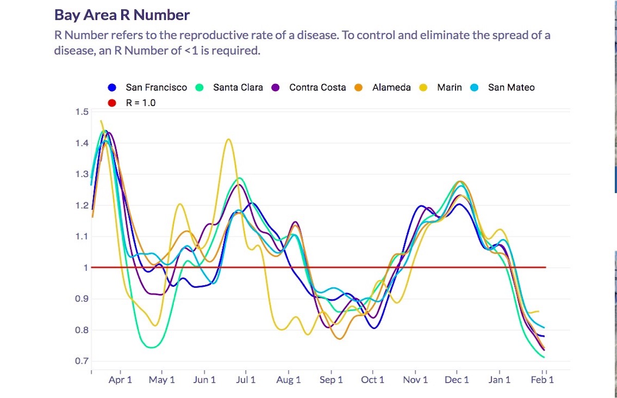 We will probably be hearing more about the R Number in the weeks to come. To thwart the B117 variant, some suggest we will need to lower the current R Number below .7 and keep it there.Ā Today’s estimates for the San Francisco R Number range from .72 to .97, with an average of over .75. The estimate for California ranges fromĀ .7 to .94 for an average of .76.