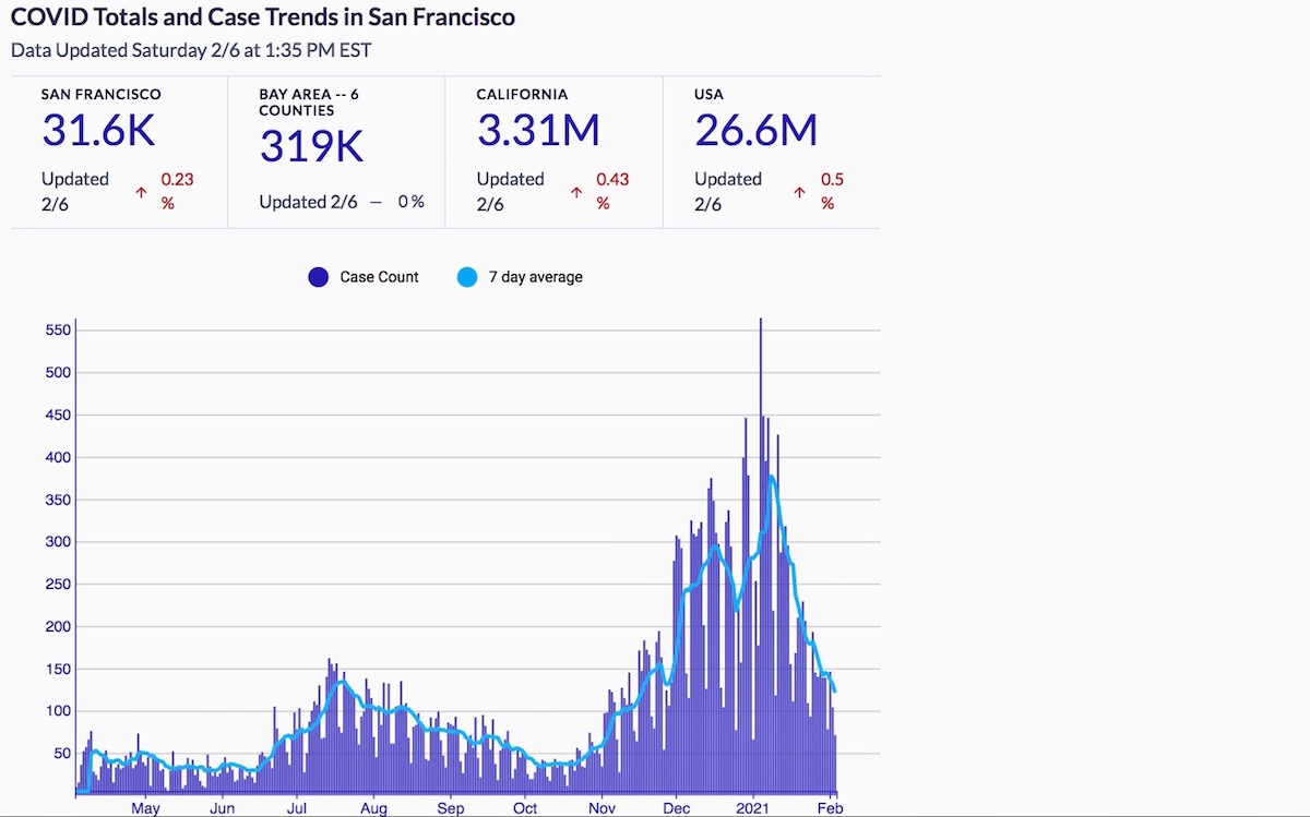 Vaccinations are improving. As of February 4, 11 percent (79,233) of San Francisco residents over 18 have received one dose, while over 3 percent (21,732) have received two. On February 4, 3410 shots were delivered, and the seven day rolling average of shots per day increased to 3,535.6. The DPH goal is 10,000 shots per day.