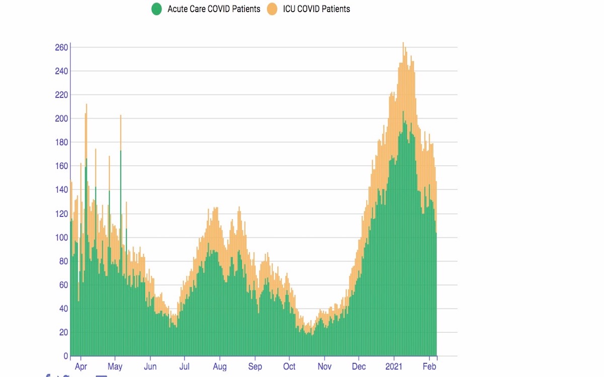 ICU cases continue to be relatively high, but total Covid Hospitalizations are down. Today’s numbers include 2 ICU transfers, and 1 Acute Care transfer. For the week ending February 7, the rate of weekly change in Covid positive patients fell 10 percent.Ā Ā During that week,Ā the seven-day average availability of ICU beds was 28 percent and Acute Care availability remained 21 percent. On February 7, DPH reports 91Ā available ICU beds and 419 available Acute Care beds.Ā