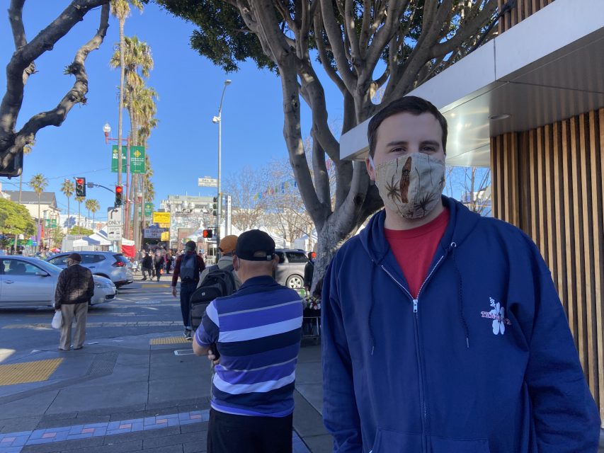 Adam, a Trader Joe’s employee, stands in the waitlist line for a Covid-19 vaccine at 24th and Capp streets. Photo taken by Annika Hom on Feb. 24, 2021.