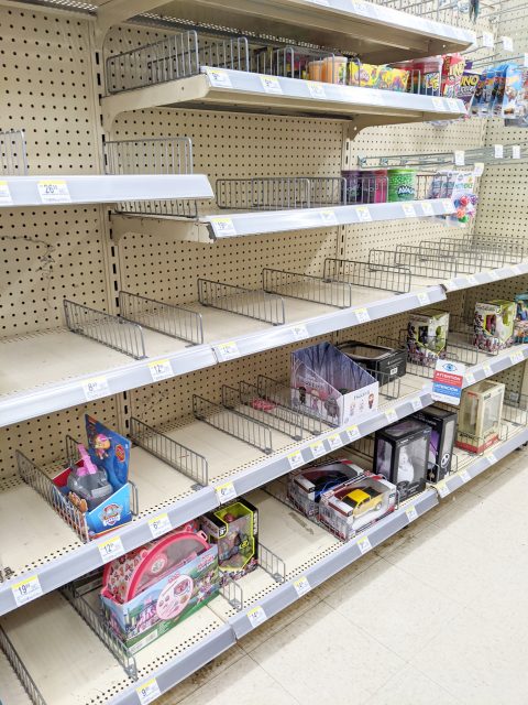 A mostly empty toy aisle at the Walgreens at Mission and 30th. Photo by Beth Winegarner.