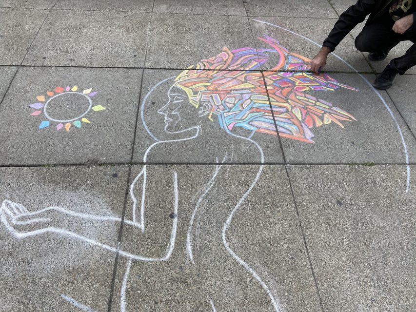 Larson, who is 43, lives in the Mission and comes out to draw on the sidewalk to keep his sanity during the pandemic, which has “been pretty tough on mental health.”